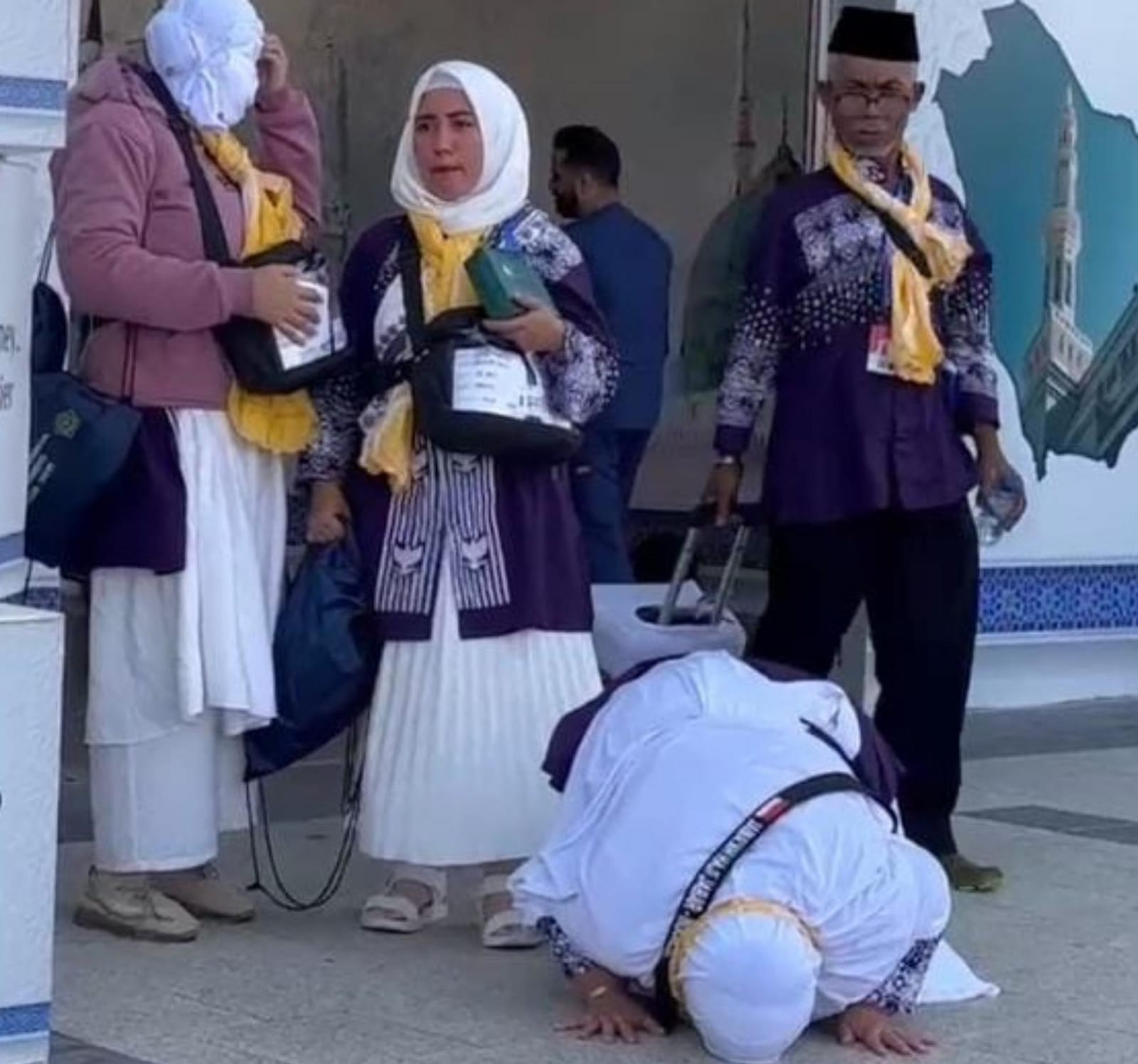 MADINAH, MEMORANDUM– Suasana haru dan syukur menyelimuti Ibu Ani (49) saat tiba di Kota Nabi. Meskipun diterpa panas terik dengan suhu mencapai 42 derajat Celcius, ia tak kuasa menahan diri untuk sujud syukur di pelataran Bandara Amir Mohammad Bin Abdul Aziz (AMAA) Madinah.