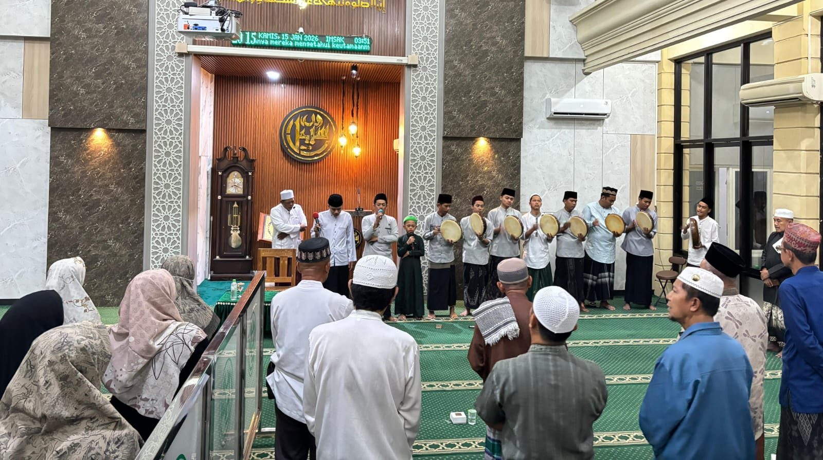 Diiringi tabuhan rebana dari Tim Banjari Remaja Masjid (REMAS) Sabilillah, seluruh jamaah yang hadir tampak larut dalam lantunan salawat nabi.