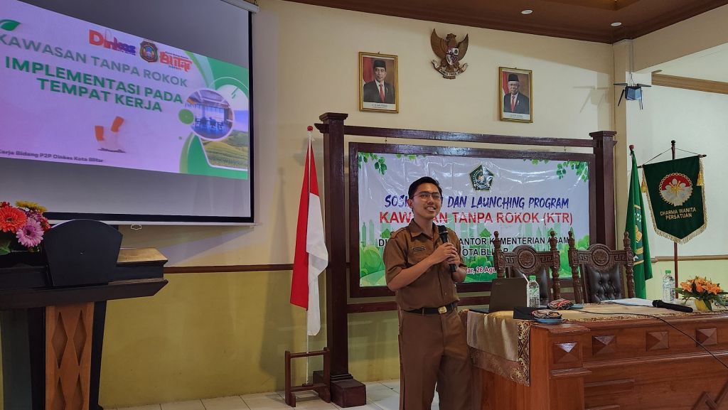 BLITAR,MEMORANDUM – Sebuah gebrakan program kembali dilakukan oleh Kantor Kementerian Agama Kota Blitar, diinisiasi oleh Kepala Kantor, M.Kanzul Fathon mendeklarasikan area kerja kantor dan KUA sebagai Kawasan Tanpa Rokok (KTR),pada Senin 26 Agustus 2024.