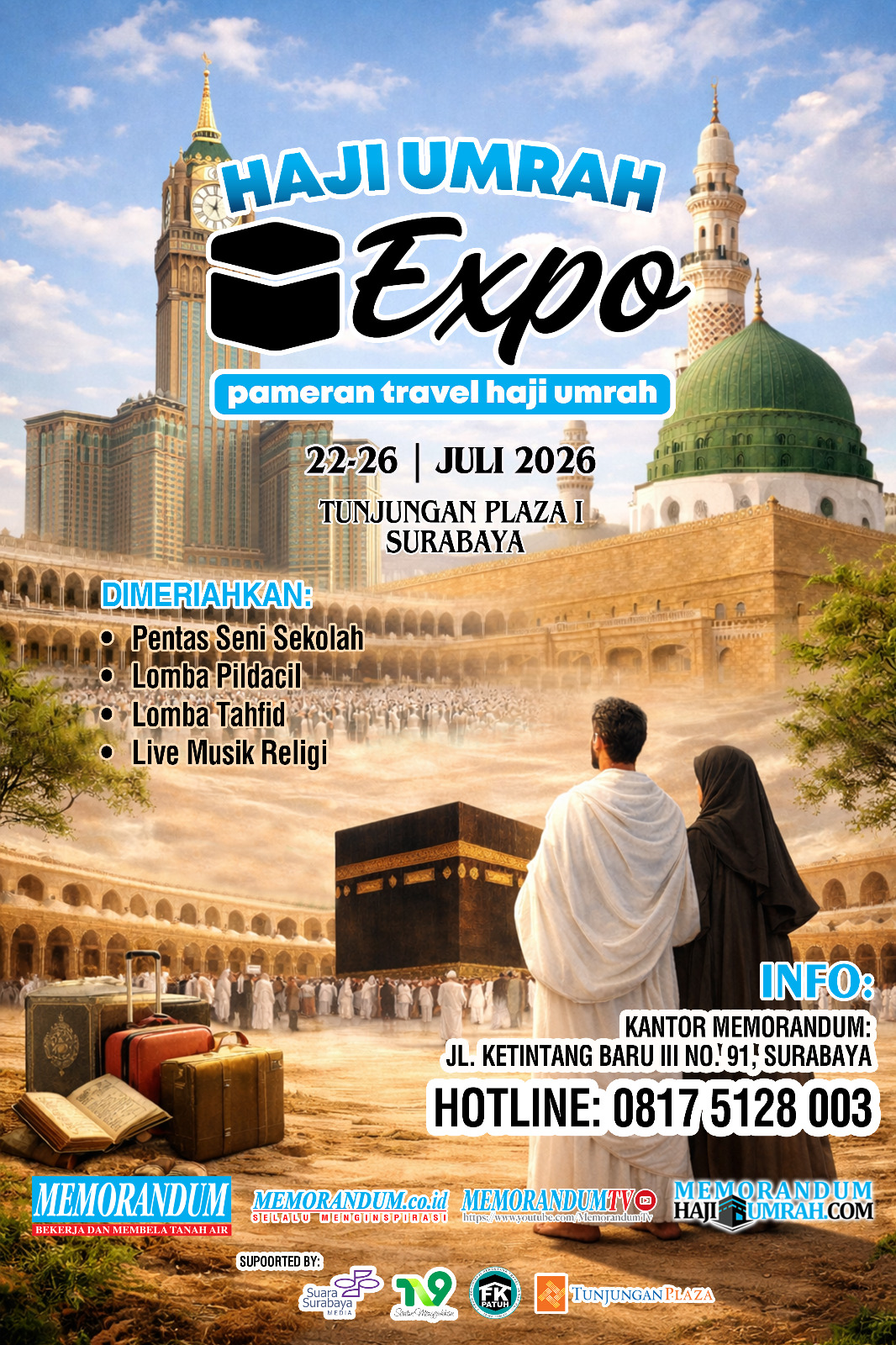 MEMORANDUM – Surat Kabar Harian Memorandum bekerja sama dengan Forum Komunikasi Travel Umrah dan Haji (FK Patuh) kembali menggelar pameran travel umrah dan haji khusus di mall terbesar. Kegiatan ini akan berlarngsung pada Rabu hingga Ahad, 22–26 Juli 2026 di Tunjungan Plaza Surabaya.